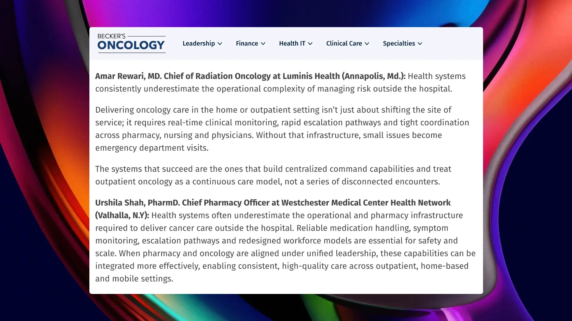 Becker's Healthcare: 11 Oncology Leaders on the Complexity of Moving Cancer Care Beyond Hospital Walls